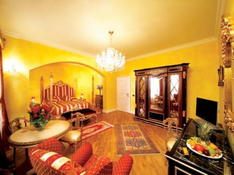 - Royal suite — комфортабельный номер, максимально для 3-х человек, в ванной комнате — ванна, 1 спальня, размер кровати queen bed 160х200см, возможны дополнительная и детская кровати, размер номера 52-75 м2;