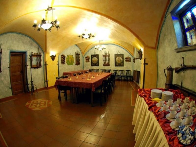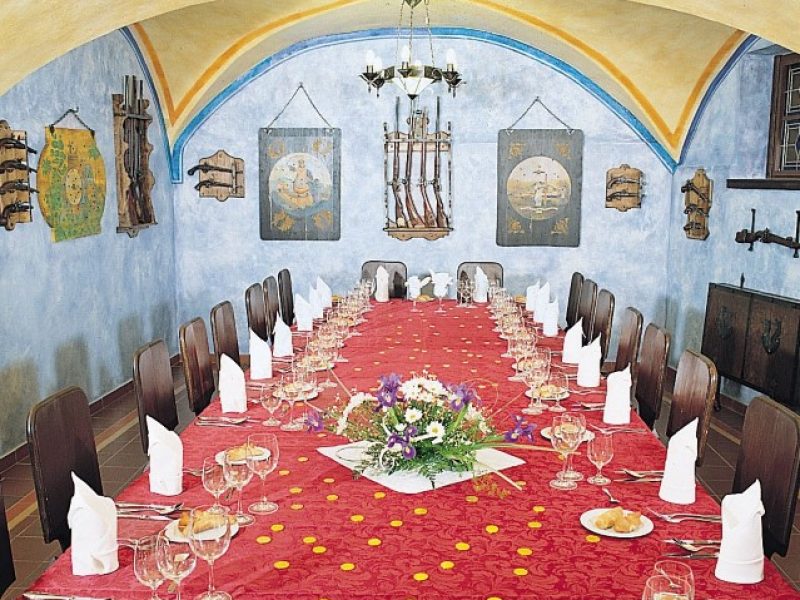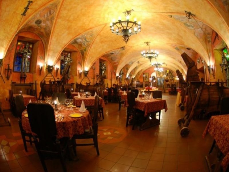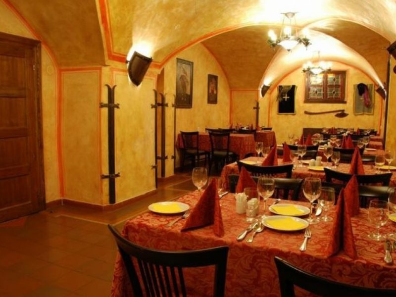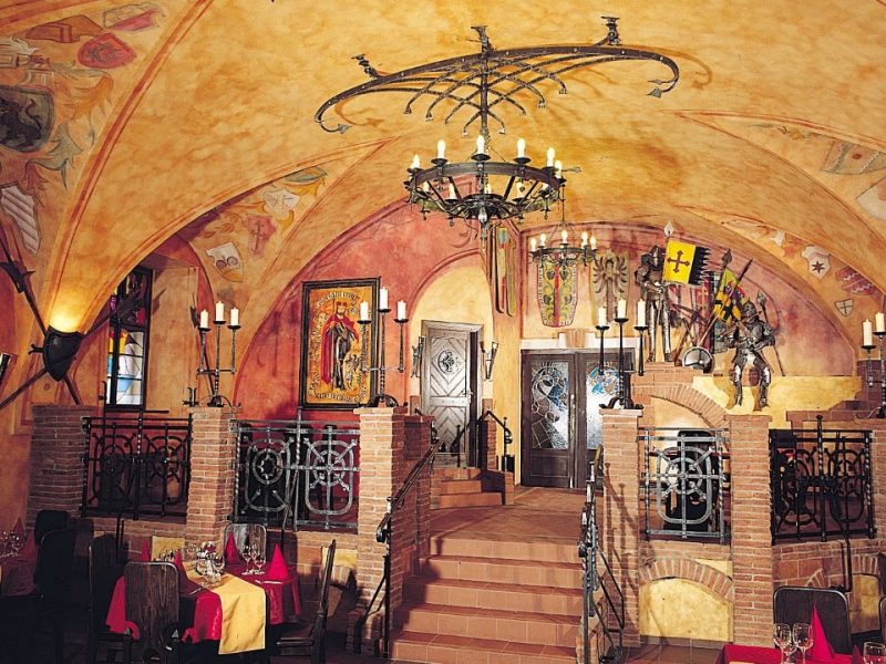 жемчужиной отеля можно по праву назвать Рыцарский зал с дизайном в стиле 17-го столетия, где на гостей со стен, как в музее, взирают рыцари в доспехах и по стенам висят копии средневекового оружия. Раньше здесь находился манеж, а в настоящее время Рыцарский зал является благодаря интерьеру со сводчатыми потолками и роскошному оформлению в историческом стиле одним из самых привлекательных заведений Праги. Атмосферу средневековья дополняет музыка той эпохи. Если повезет, то во время трапезы можете увидеть здесь неповторимый рыцарский турнир в сопровождении прекрасных танцовщиц или выступление турецкого факира. Одновременно у гостей будет возможность по достоинству оценить умение поваров и профессиональное обслуживание. Ассортимент вин включает только самые качественные чешские марки. В баре гости могут насладиться прохладительными напитками, приготовленными по их заказу или фирменному рецепту бармена. Другие услуги: камера хранения багажа, круглосуточное обслуживание номеров, пункт обмена валюты, бизнес-центр, парковка, аренда автомобилей, прачечная, химчистка, Wi-Fi подключение к Интернет.