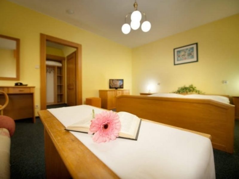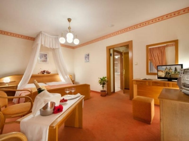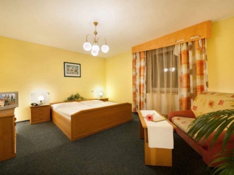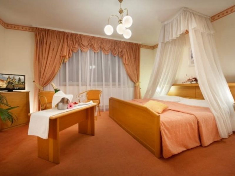 спутниковое телевидение, телефон, радио, мини-бар, ванная/душ. Интерьер отеля декорирован в сочетании гаммы золотистых и бордовых тонов, номера просторные светлые, современная комфортная мебель располагает к отдыху после увлекательных прогулок по историческим местам Праги. Для того чтобы лучшие минуты жизни стали незабываемыми предназначен Люкс для новобрачных.