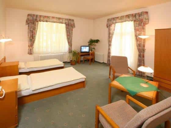 - корпус Чапек: предлагает комфортное размещение, он соединен с главным зданием коридором, где находится ресторан. В Чапеке 13 двухместный номеров и 1 апартамент с ванной комнатой, туалетом, феном, халатом . Дальше в нем находится гостиничная косметика, телевизор с сателлитом, радиобудильник, телефон с прямым набором номера, холодильник с минибаром, сейф и балкон. В здании находится лифт. На первом этаже находится кабинет курортного врача, расписание процедур, офис заведующего бальнеологическим комплексом, кабинет массажа и оксигенотерапия. На цокольном этаже располагается часть бальнеологического комплекса.